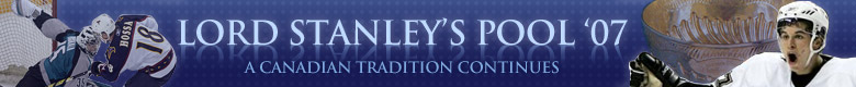 Patrick Gill, after a long climb, used two Daniel Alfredsson goals in the second period of Ottawa's loss to climb into first place in the pool. Gill likely used his winnings ($792) to finance a round of drinks at his Sens-friendly pub where most were crying in their beer. David Loop took advantage of the bonus points for picking Anaheim to jump cleanly into second place ($396). Congratulations! Chappell falls on last day 7/6/2007 12:23:31 AM Keith Chappell, the leader from one week into the pool until the last night, lost grip of his slim lead to fall into a tie for third with Gerald Wexler, who was in the top three since round two. Chappell had a consistently small lead throughout the pool but still demonstrated tremendous staying power. They will split the third place prize, taking home $66 each. Anaheim wins in decisive fashion 7/6/2007 12:18:33 AM Anaheim took advantage of deflections, tip-ins, and luck to cruise to a 6-2 victory in the Cup-winning game. Andy McDonald picked up two points for Anaheim while Daniel Alfredsson scored both Ottawa goals. Lead narrows... photo finish coming 4/6/2007 10:48:13 PM We may be in for a photo finish in Lord Stanley's Pool 2007. Patrick Gill has narrowed the Keith Chappell's lead to one point and with extra players could very well tie or surpass him. The big question will be whether David Loop, the leading Anaheim contender, can get a few points from Teemu Selanne to tip the balance if the Ducks win. Ottawa on the ropes 4/6/2007 10:39:02 PM Ottawa played only one good period on Monday, and they return to Anaheim down three games to one as a result. The Sens need three straight games of three good periods if the want to win, otherwise Disneyland could be planning a parade. McDonald scores two, Anaheim wins 6/4/2007 10:35:40 PM Daniel Alfredsson and Dany Heatley scored for Ottawa, but Andy McDonald was the hero for Anaheim with two goals and an assist. McDonald's three-point night lifted Sophie Wexler into seventh place, the top among twelve picks who took the player. Pronger suspended again 3/6/2007 8:49:05 PM Chris Pronger will miss his second straight game four after elbowing Dean McAmmond in the head on Saturday night. Anaheim won the game he missed and had not lost since then until last night's game, but it is nevertheless a big blow to the Ducks' defensive wall. |